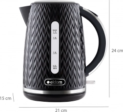 Štýlová rýchlovarná kanvica ELDOM C260 Nelo s objemom 1,7 l a výkonom 2000 W spoľahlivo uvarí vodu pre celú rodinu. Ponúka bezdrôtové prevedenie s 360° otočnou základňou, prehľadný ukazovateľ hladiny vody, automatické vypnutie a trojitý bezpečnostný systém. Kvalitné komponenty OTTER, pohodlné tlačidlo na otvorenie veka a moderný textúrovaný dizajn sa skvele hodia do každej kuchyne.