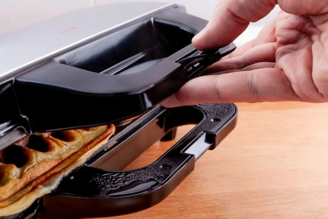 Povrch platní má nepriľnavú úpravu, takže cesto sa nepripáľa a čistenie je otázkou chvíľky. Bezpečnú manipuláciu zabezpečuje chladná rukoväť, stabilitu počas práce zas protišmykové nožičky. Prístroj je navrhnutý tak, aby ste vždy upiekli 2 veľké wafle so skvelou štruktúrou.