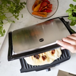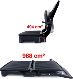 Horná platňa s plávajúcim uchytením sa automaticky prispôsobí rôznej hrúbke surovín. Vďaka nastaviteľným nožičkám možno zmeniť sklon pre efektívny odvod tuku do dodaných nádobiek. Praktické detaily ako svetelné indikátory, zámok veka pre jednoduché skladovanie, priestor pre kábel v základni a chladná rukoväť robia z tohto modelu skvelého pomocníka do každej kuchyne.