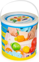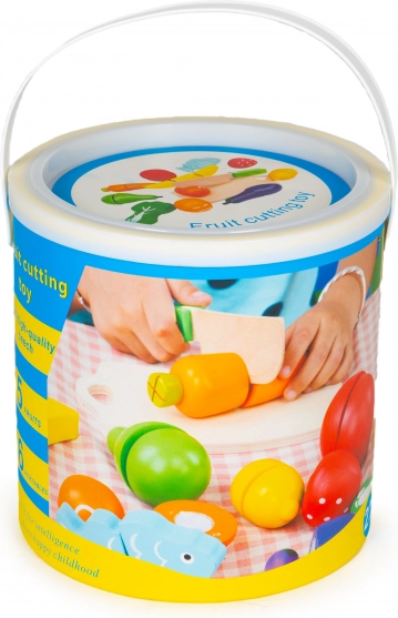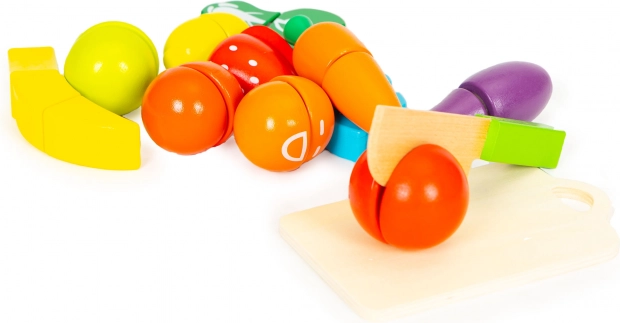 Diely ovocia a zeleniny sa spájajú na suchý zips, takže krájanie na doske znie aj pôsobí realisticky. Deti si bezpečne skúšajú kuchárske zručnosti a rozvíjajú fantáziu.