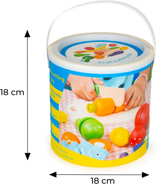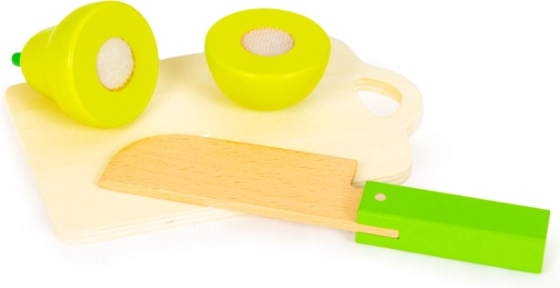 Bezpečný drevený nôž a dieliky rozdelené na polovice podporujú jemnú motoriku, správny úchop aj koordináciu oko–ruka. Ideálne pre deti od 3 rokov.