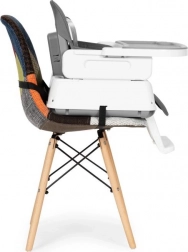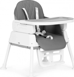 Kreslo je výškovo nastaviteľné. Nohy a podnožku môžete jednoducho odňať, vďaka čomu vysoké kreslo možno premeniť na nižšiu stoličku. Jedinečným prvkom stoličky je jej sedák, ktorý môžete využiť pri upevnení na stoličku v jedálni alebo kuchyni. Súčasťou sady sú špeciálne upevňovacie popruhy na sedák a operadlo klasickej stoličky.