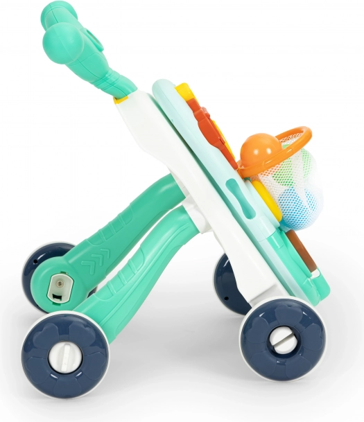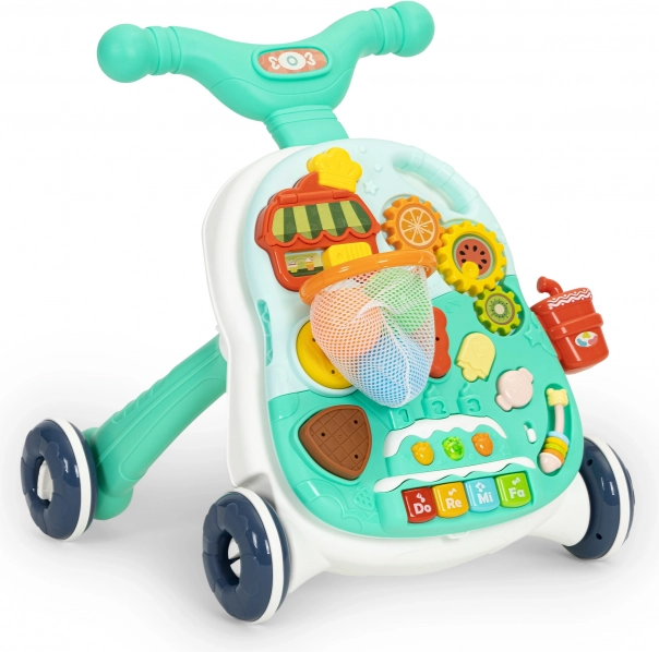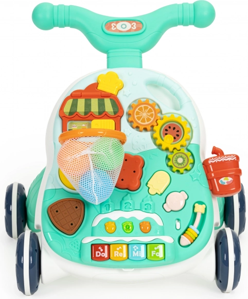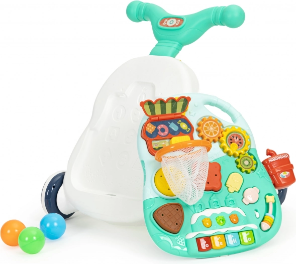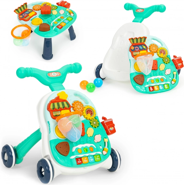 Stačí oddeliť panel na prednej strane chodítka, nainštalovať nožičky a môžete používať funkčný stolík s mnohými pohyblivými prvkami. Zaujímavým doplnkom je malý klavírik, ktorý prehráva zvuky a melódie, ten sa určite rýchlo stane obľúbeným prvkom hračky a poskytne každému dieťaťu skvelú zábavu.