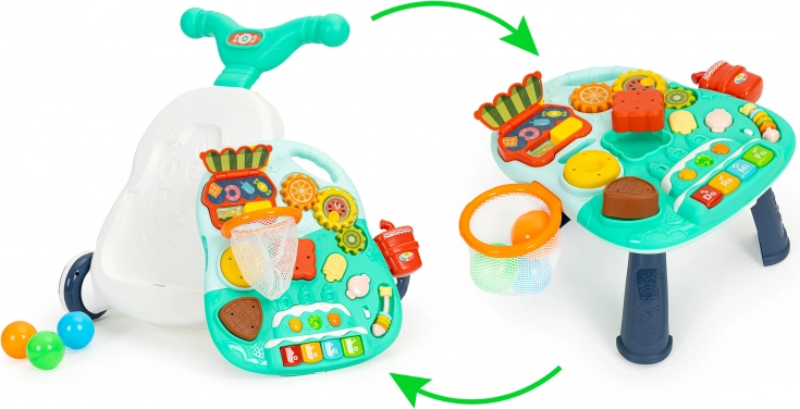 Stolík sa skladá z predného panelu chodítka a 3 nôh, ktoré sú súčasťou sady. Vďaka možnosti odpojenia ho vaše batoľa môže používať ako samostatnú hračku alebo ho premeniť na funkčný stolík plný prvkov zaručujúcich skvelú zábavu.