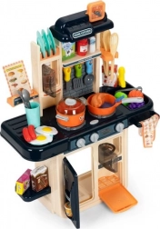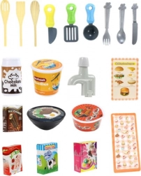 Bohatá sada 42 prvkov zahŕňa hrniec s pokrievkou, panvicu, náradie, taniere, hrnček, ovocie a zeleninu, rybu, kurča, kraba, vajíčko, balenie „mlieka“, „kečup“, krabičky od zmrzliny a ďalšie. Všetko je z kvalitného plastu a kartónu, bez ostrých hrán pre bezpečnú hru. Kuchynka podporuje role-play, učí základy varenia a poriadku.
