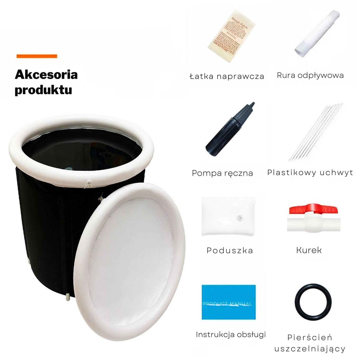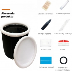 - opravná záplata, odtoková hadica, ručná pumpa, plastový držiak, vankúšik, kohútik, návod na použitie, tesniaci krúžok
