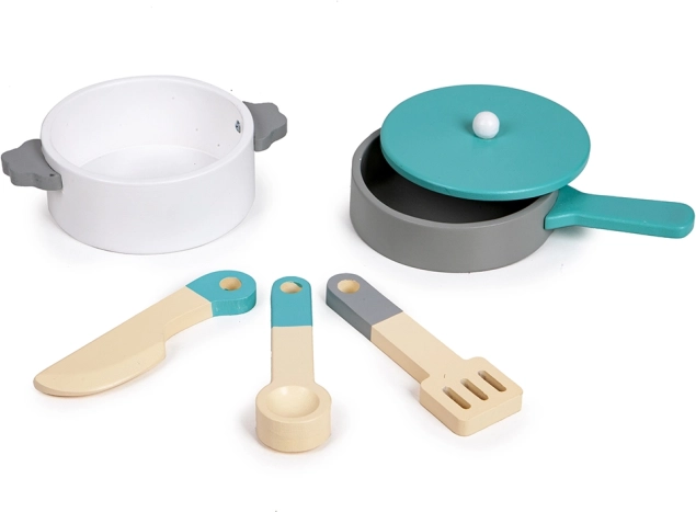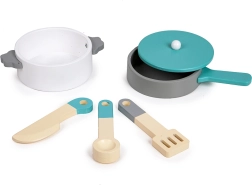 Súčasťou je „práčka“ na hru na domácnosť a päť drevených doplnkov: hrnček, panvica s pokrievkou, lyžica, obracačka a nôž. Všetko z bezpečne lakovaného dreva.