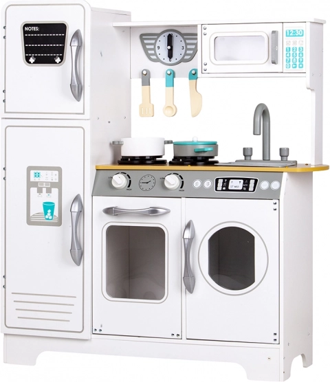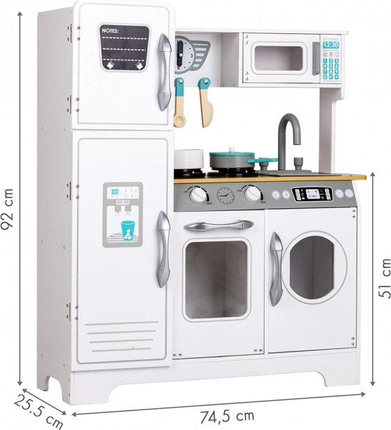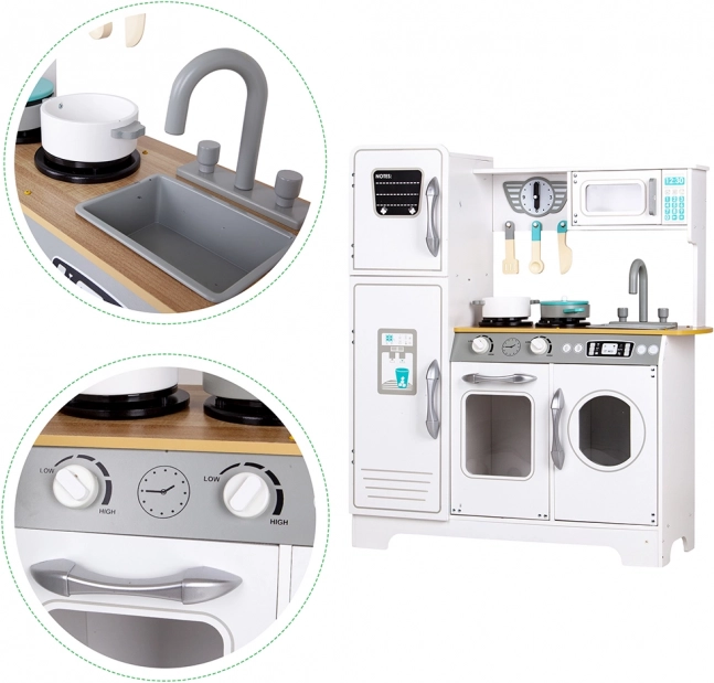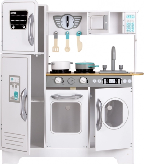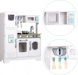 Štýlová detská kuchynka z masívneho dreva pre malých kuchárov od 3 rokov. Ponúka realistické ovládacie gombíky s cvakaním, otváraciu chladničku, rúru a mikrovlnku, priestranný drez a dokonca aj „práčku“ na hru na domácnosť. Súčasťou je 5 drevených kuchynských doplnkov na hodiny kreatívnej zábavy a rozvoj fantázie a jemnej motoriky.