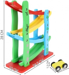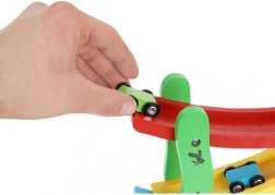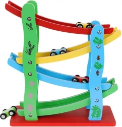 Sada obsahuje drevenú sklzy s 4 rôznofarebnými dráhami a 4 autíčka. Všetko je vyrobené z dreva, čo zaisťuje vysoký štandard bezpečnosti.