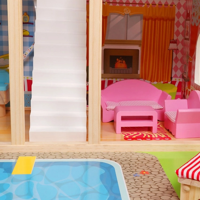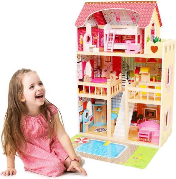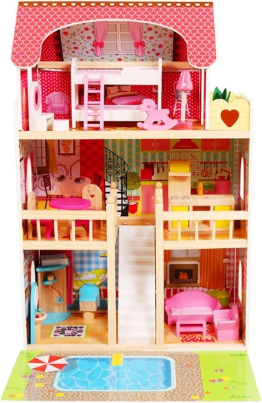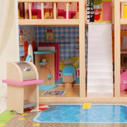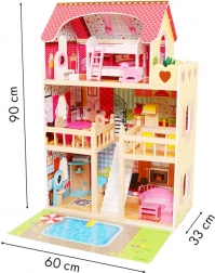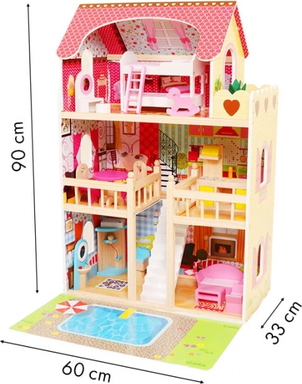 Veľký drevený domček pre bábiky ECOTOYS ponúka 3 poschodia a 6 miestností, LED osvetlenie pre čarovnú atmosféru a 16 kusov dreveného nábytku. Stabilná a bezpečná konštrukcia je ideálna pre deti od 3 rokov, podporuje fantáziu, kreativitu a jemnú motoriku. Súčasťou je aj herná podložka s motívom bazéna pre ešte zábavnejšie hranie.