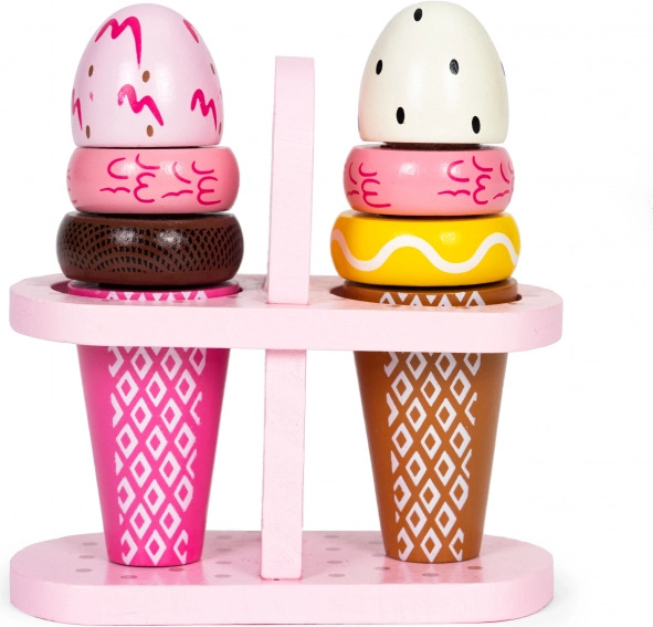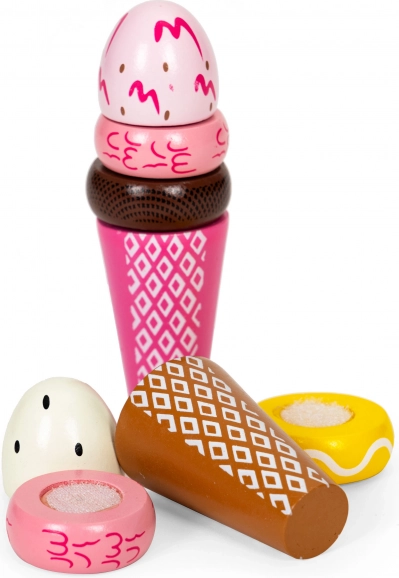 Súprava obsahuje 9 prvkov z kvalitného dreva, ktoré spájajú suchý zips, a je vhodná pre deti od 3 rokov. Rozmery zmrzliny sú 12 cm, stojan meria 6x12x12,5 cm.