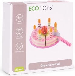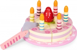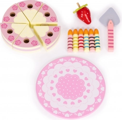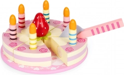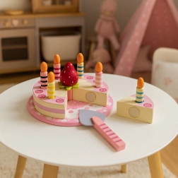 Obsah sady: okrúhla torta rozdelená na porcie, 6 pruhovaných sviečok, drevená jahôdka, servírovacia lopatka a ozdobný tanier. Všetko je vyrobené z dreva a natreté farbami bezpečnými pre deti. Sada podnecuje rolové hry, trénuje koordináciu oko–ruka a učí deti zdieľaniu aj obsluhe hostí.