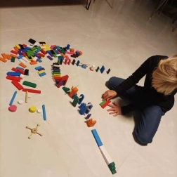 Tento bohato vybavený set kombinuje klasické drevené domino s prvkami guľôčkovej dráhy pre ešte väčšiu zábavu. Vďaka širokej palete živých farieb a rozmanitým komponentom deti postavia jedinečné trate, mosty a schody, po ktorých sa rozbehne očarujúca kinetická reťazová reakcia. Hra rozvíja koordináciu oko–ruka, trpezlivosť aj logické myslenie.