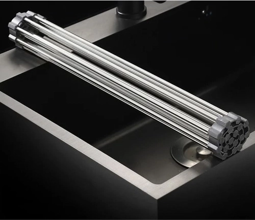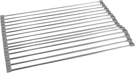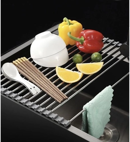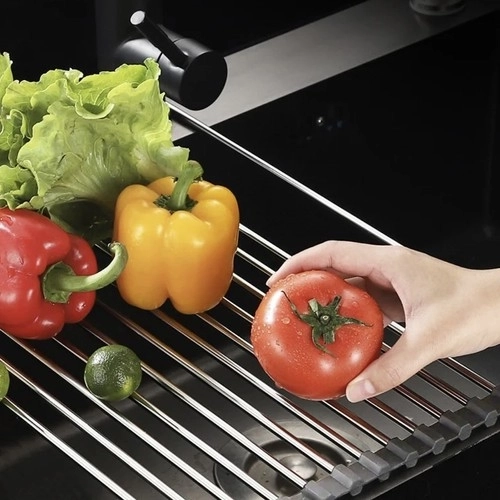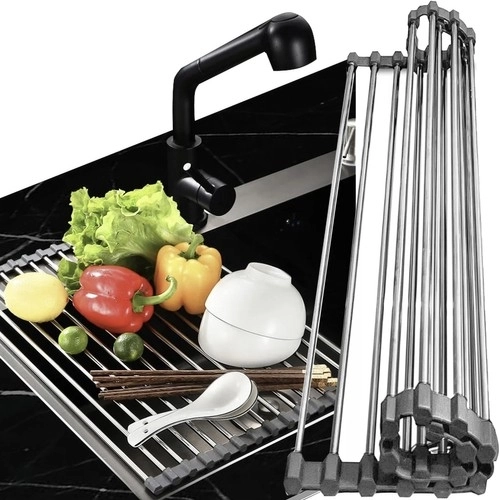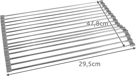 Praktický roll-up odkvapkávač na drez z kovových tyčiek so silikónovými okrajmi šetrí miesto a udržiava poriadok na kuchynskej linke. Dá sa jednoducho zrolovať, použiť ako podložka pod horúce hrnce a vďaka silikónovým okrajom chráni drez aj riad pred poškrabaním. Ideálny na každodenné použitie, rýchle sušenie a hygienické odkvapkávanie. Rozmer 29,5 × 47,8 cm, ľahká a skladná konštrukcia. Univerzálne použitie, skladací dizajn, odolné materiály.