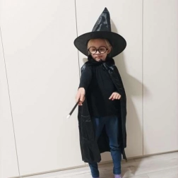 Tento štýlový kostým kúzelníka ponúka všetko, čo deti potrebujú na vytvorenie pôsobivého a bezpečného prevleku. Ľahký plášť z príjemného materiálu elegantne splýva a vďaka viazaniu dobre drží na mieste. Špicatý klobúk sa po vybratí sám rozloží a vykúzli efekt „wow“. Okrúhle okuliare bez skiel sú pohodlné a bezpečné pri hre, palička z odolného plastu skvele doplní každý trik.