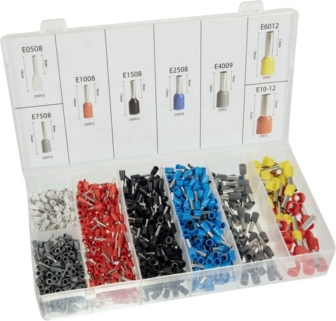 - 200× 0,50 mm² (biela), 200× 0,75 mm² (svetlosivá), 200× 1,00 mm² (červená), 250× 1,50 mm² (čierna), 250× 2,50 mm² (modrá), 50× 4,00 mm² (sivá), 25× 6,00 mm² (žltá), 25× 10,00 mm² (červená) – dĺžky 8–12 mm