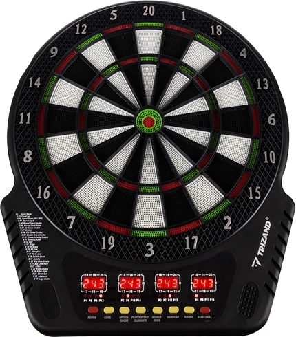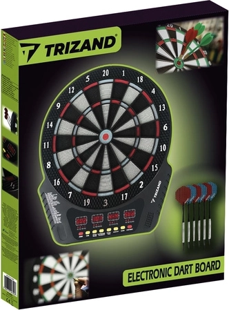 Elektronický terč TRIZAND: 27 hier, 243 kombinácií, LCD, 1–16 hráčov, priemer 34,5 cm. Vrátane 6 šípok a 24 hrotov. Napájanie zo siete aj na batérie.