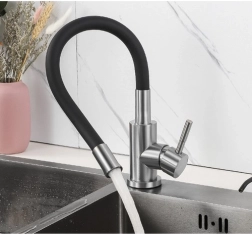 Táto dizajnová batéria kombinuje flexibilitu a odolnosť pre každodenné použitie v kuchyni. Elastická hadica drží nastavený tvar, umožňuje presne smerovať prúd vody a vďaka otočnému 360° krku pohodlne dosiahnete do všetkých kútov drezu. Saténová nehrdzavejúca oceľ a kvalitný silikón odolávajú škvrnám, vyblednutiu aj vysokým teplotám.