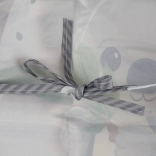 Priestranné predné vrecko zbiera omrvinky a kvapky. Zapínanie na suchý zips pri krku a zaväzovanie na chrbte zaistí isté držanie.