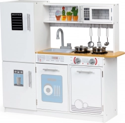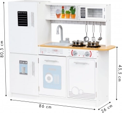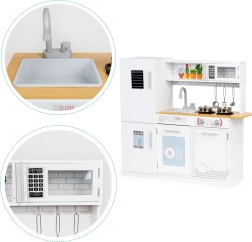 Táto detská kuchynka ponúka všetko, čo malý kuchár potrebuje. Stabilná a pevná konštrukcia zabezpečuje bezpečnosť pri hre. Deti si užijú zábavu s otáčacími gombíkmi, otváracou rúrou a mikrovlnkou, ako aj priestrannou chladničkou s mrazničkou. S touto kuchynkou môže dieťa napodobňovať dospelých kuchárov a získavať tak prvé kuchárske zručnosti.