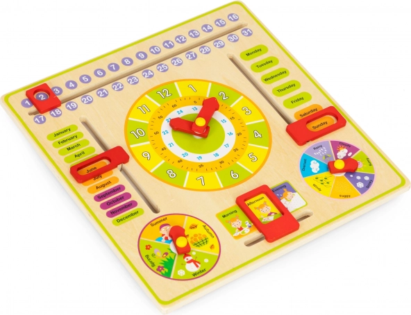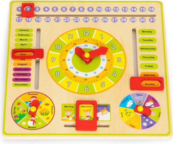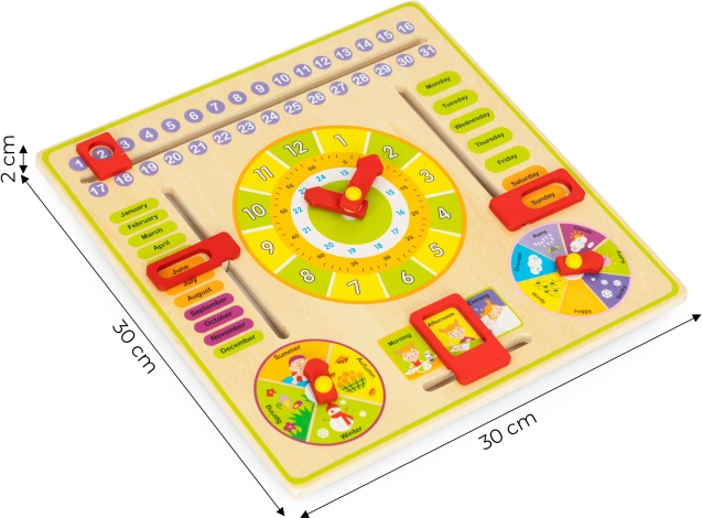 Doska umožňuje deťom naučiť sa dni v týždni, mesiace a ročné obdobia a zároveň im pomáha správne čítať čas. Navyše rozvíja manuálne zručnosti a neobsahuje ostré hrany, čo je bezpečné pre deti.