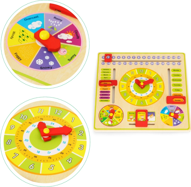 Deti môžu sledovať rôzne druhy počasia a učiť sa o nich pomocou obrázkových symbolov, ako sú slnko, vietor, mraky, dážď alebo sneh. Doska tiež obsahuje hodiny s nastaviteľnými ručičkami pre učenie merania času.