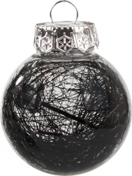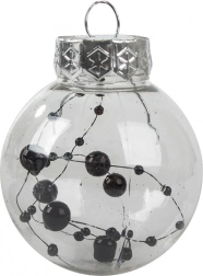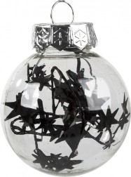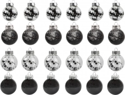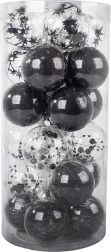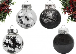 Štýlová sada vianočných ozdôb v modernej kombinácii čiernej a transparentnej rozžiari každý stromček. V balení nájdete 24 ks ľahkých, nerozbitných plastových gúľ s priemerom 6 cm v 4 rôznych štýloch – trblietavé, s guličkami, s niťami a s hviezdičkami. Ideálne na bezpečnú a elegantnú sviatočnú výzdobu.