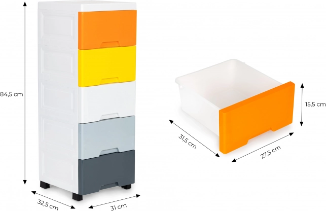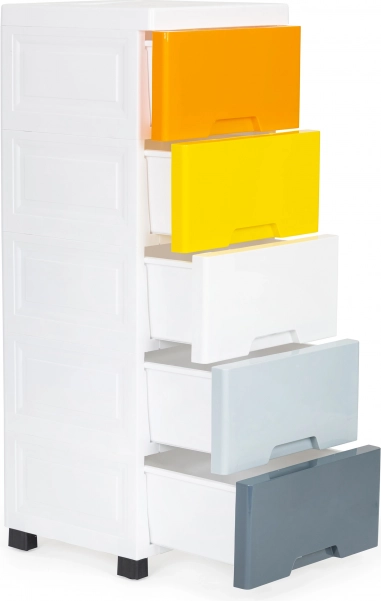 Užite si prehľadné a štýlové ukladanie hračiek, kozmetiky alebo drobností. Tento vysoký a úzky organizér šetrí miesto, pričom päť priestranných zásuviek v rôznych farbách pomáha s triedením a rýchlym nájdením vecí. Čistý biely rám zapadne do moderných interiérov a ľahko sa udržiava.