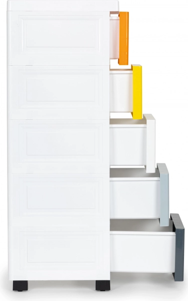 Päť priestranných šuplíkov v rôznych farbách zjednoduší triedenie a rýchlu orientáciu. Predné ergonomické úchyty umožňujú plynulé vysúvanie a zasúvanie.