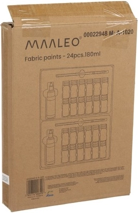 Sada MAALEO prináša 24 starostlivo vybraných odtieňov, ktoré možno medzi sebou miešať a vytvárať tak vlastnú paletu pre originálne potlače a maľby na textil. Vďaka akrylovej báze farby rovnomerne kryjú a nepopraskajú ani po mnohých praniach. Na rýchlejšiu fixáciu motívu je možné hotovú potlač zažehliť na rube cez papier na pečenie (3–5 minút, cca 150 °C).