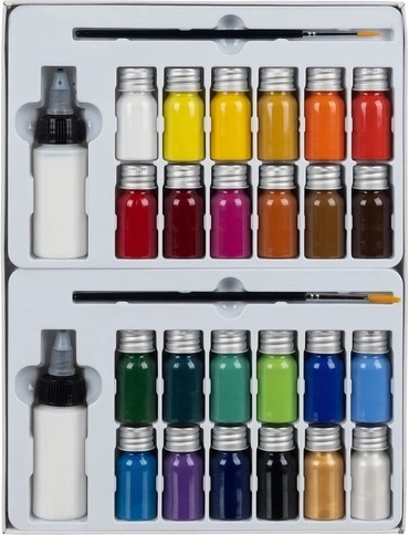 V balení nájdete všetko, čo potrebujete: 24 fľaštičiek farieb, 2 regulátory na riedenie či prípravu riedkych tkanín a 2 štetce na jemné detaily aj väčšie plochy. Praktické farebné balenie chráni obsah a udržiava prehľad v odtieňoch.