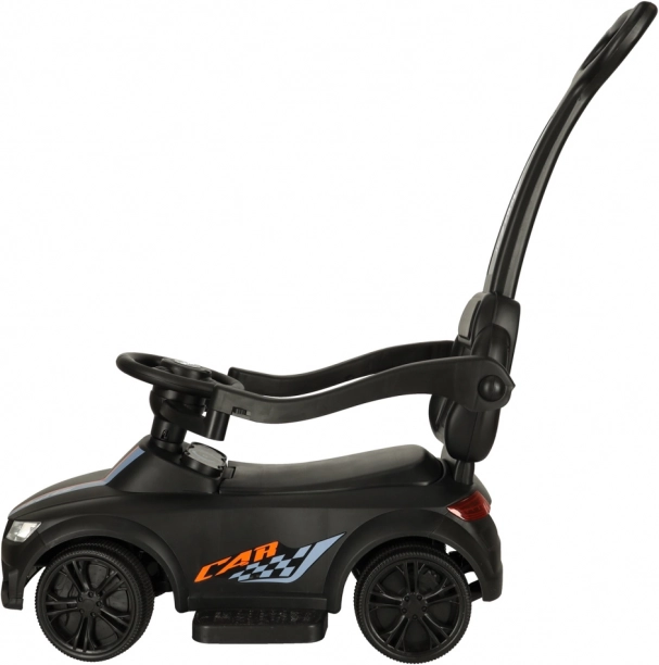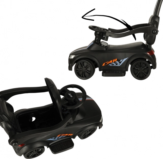 Čierne odrážadlo – tlačiace autíčko 3v1 rastie s dieťaťom od 12 mesiacov: ponúka vodiacu rukoväť pre rodičov, bezpečnostné madlá a opierku na prvé jazdy a možnosť postupnej demontáže pre samostatné odrážanie. Realistické svetelné efekty a zvuky (na 3× AA) premenia každú jazdu na zábavné dobrodružstvo.