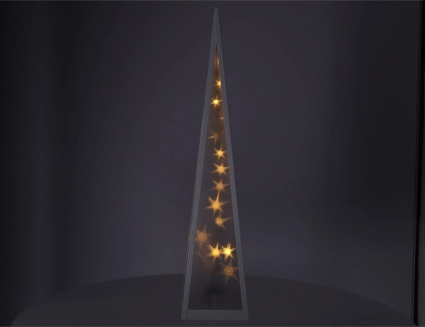 Plastová pyramída s bielym kovovým rámom vyplneným hviezdami, ktoré sa pohybujú uprostred pyramídy ✨