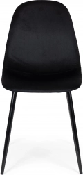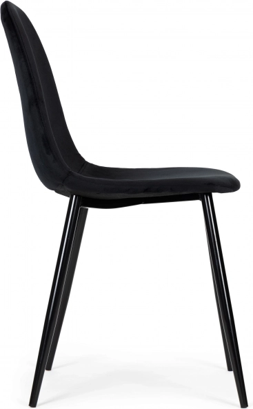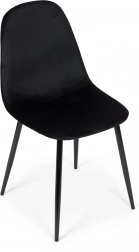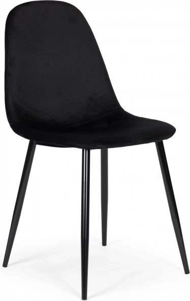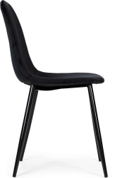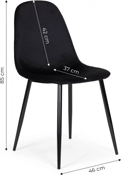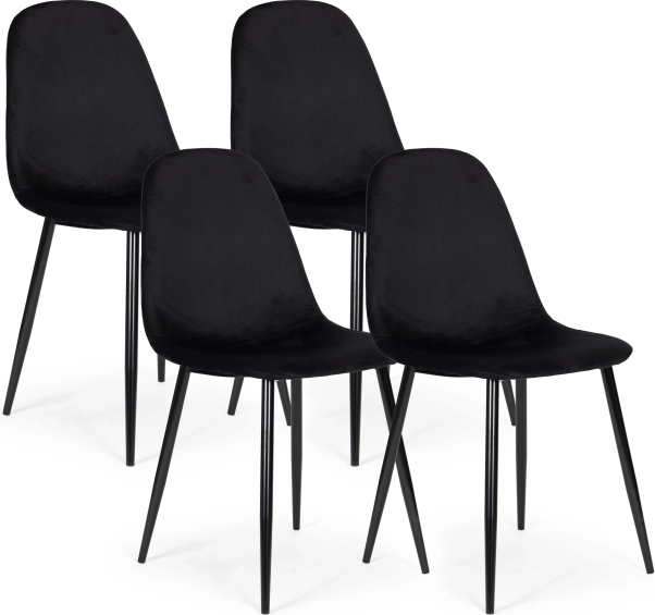 Štýlová sada štyroch stoličiek zaujme moderným dizajnom, zamatovým čalúnením a kovovými nohami pre dlhú životnosť. Ponúka vysoký komfort sedenia vďaka kvalitnej pene a tvarovanému operadlu. Ochranné koncovky chránia podlahu, univerzálne čierne prevedenie sa hodí do jedálne, obývačky aj kancelárie.