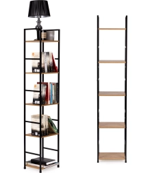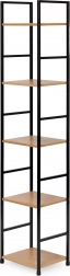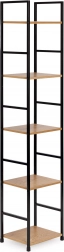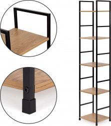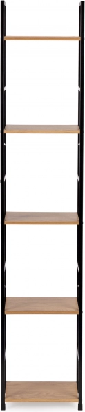 Táto moderná polica v industriálnom štýle LOFT je ideálna do menších aj väčších interiérov. Úzke prevedenie šetrí miesto, zatiaľ čo päť políc poskytuje dostatok priestoru na knihy, dekorácie, rastliny aj kúpeľňové doplnky. Práškovaný lakovaný kovový rám zaisťuje stabilitu a dlhú životnosť, police z MDF s drevodekorom dodávajú teplý prírodný vzhľad.