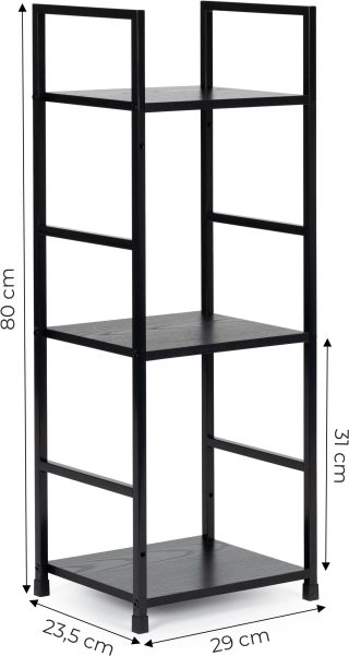 Štýlová loftová polica ModernHome kombinuje kovový rám a drevené police z MDF pre moderný vzhľad a spoľahlivú stabilitu. Tri praktické police jednoducho zorganizujú knihy, dekorácie aj kozmetiku. Vďaka kompaktným rozmerom sa hodí do obývačky, spálne, predsiene aj kúpeľne. Nohy s ochrannými pätkami chránia podlahu, súčasťou je aj uhelník na pripevnenie k stene pre väčšiu bezpečnosť.