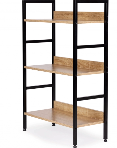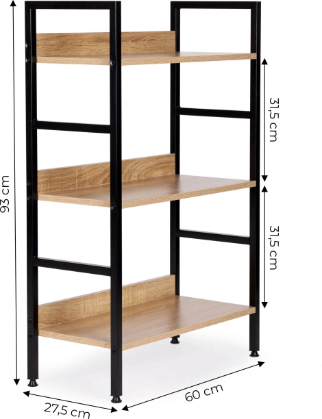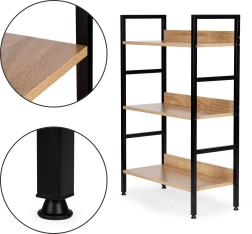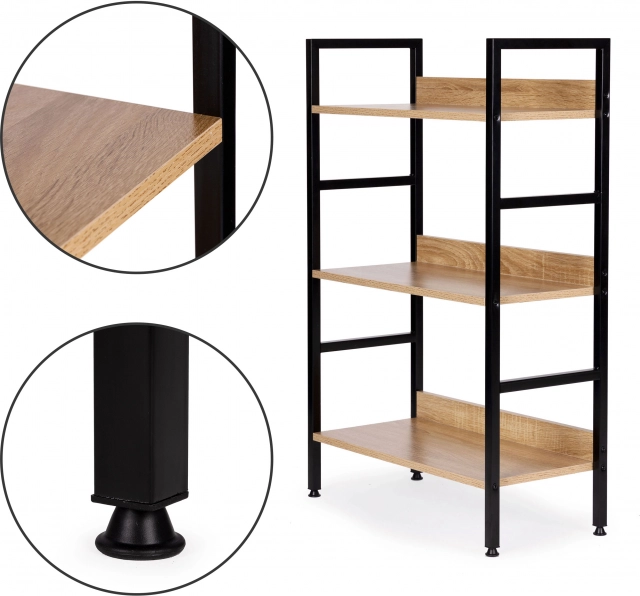 Štýlová loftová polica s tromi poschodiami prináša moderný dizajn, stabilnú kovovú konštrukciu a univerzálne využitie do obývačky, spálne, predsiene aj kúpeľne. Kvalitné MDF dosky s drevodekorom na pevnom práškom lakovanom ráme, nastaviteľné nožičky s ochranou podlahy a jednoduchá montáž z nej robia ideálne úložné riešenie pre dekorácie, knihy aj rastliny.