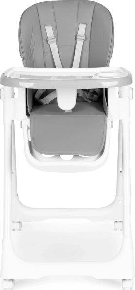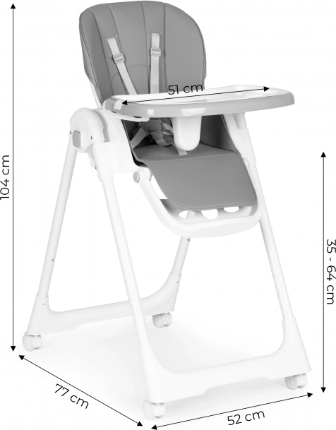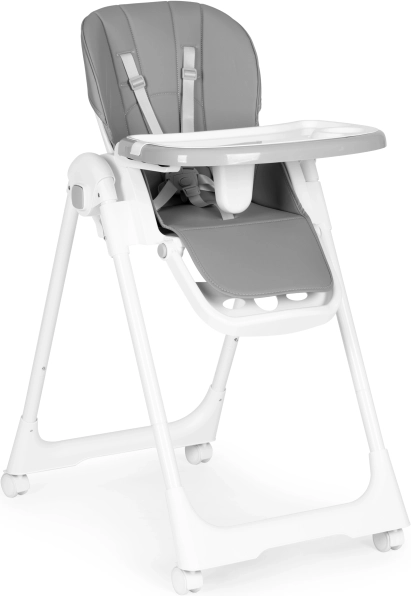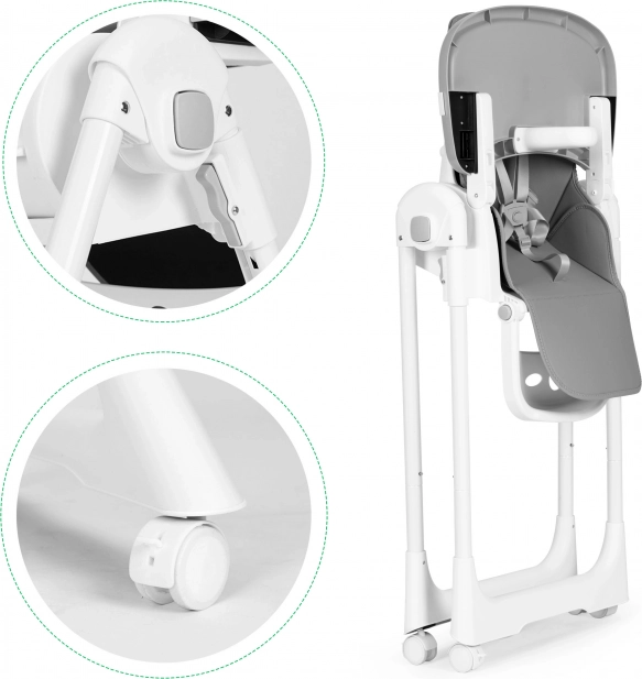 Kovová konštrukcia sa rýchlo skladá pre úsporu miesta, kolieska s gumovým behúňom a brzdou uľahčia presun bez poškrabania podlahy. 5-bodové bezpečnostné pásy a zarážka proti zosunutiu pod pultíkom zvyšujú bezpečie. Poťah z eko kože je odolný a ľahko umývateľný – ideálny na každodenné používanie.