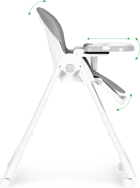Polohovateľné operadlo od zvislej až po odpočinkovú pozíciu, nastaviteľná opierka nôh a posuvný pultík umožnia perfektne prispôsobiť stoličku výške a veku dieťaťa.