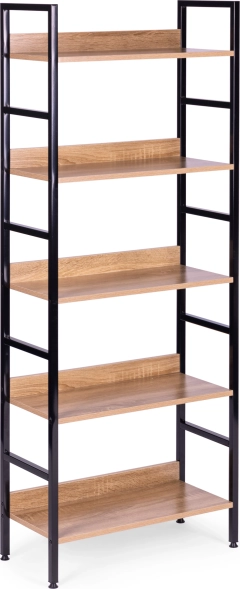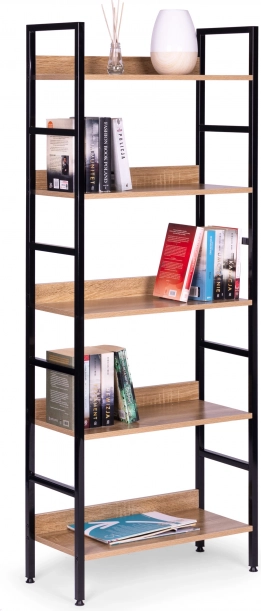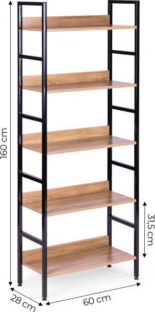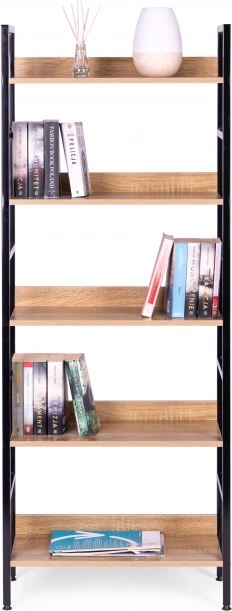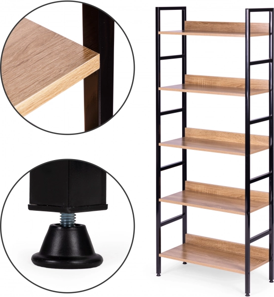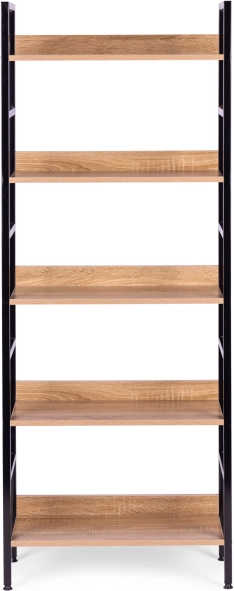 Poličky sú vyrobené z MDF dosky potiahnutej dyhou imitujúcou drevo. Ich rozmery 56 x 25,5 cm pohodlne pojmú všetky vaše obľúbené predmety. Rám knižnice je vyrobený z práškom lakovaného kovu a jeho nohy sú vybavené špeciálnymi nožičkami na ochranu podlahy.