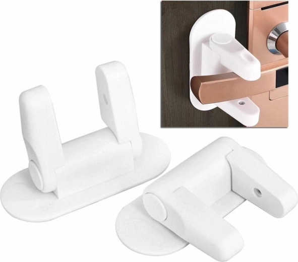 Bezpečnostné zariadenie na kľučku, ktoré bráni malým deťom otvoriť dvere alebo okno. Má veľkú základňu, ktorá umožňuje pevnú inštaláciu bezpečnostného zariadenia za kľučku pomocou lepiacej pásky. Zámok pevne priľne ku každému povrchu dverí a k okennému rámu. Ramienka siahajú až 7 cm do hĺbky, čím zabraňujú otvoreniu kľučky. Obojstranné tlačidlá na ramenách umožňujú rýchle odomknutie zámku a používanie dverí oprávnenými osobami :)