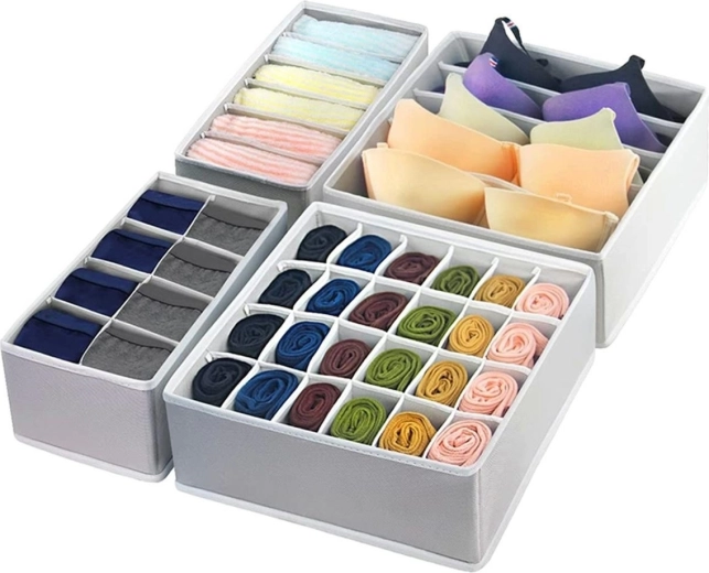 Sada 4 organizérov do zásuvky. Vložky umožňujú jednoducho, prakticky a lacno usporiadať zbierky kravát, ponožiek, opaskov a spodnej bielizne. Sada obsahuje tri organizéry rôznych veľkostí, počtu priehradiek a použitia. Sú vyrobené z odolného materiálu prepúšťajúceho vzduch. Otvorená konštrukcia umožňuje rýchly prístup k oblečeniu. Vďaka možnosti zloženia ušetríte ďalšie miesto, keď práve nepoužívate žiadnu z vložiek.