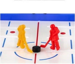 Komplet obsahuje všetko, čo potrebujete na hru: ihrisko, dvoch brankárov, dve bránky, dva puky a desať hráčov. Vďaka kompaktným rozmerom 53 × 37,5 × 7 cm sa ľahko zmestí na bežný stôl a rýchlo sa pripraví na hru. Vhodné pre deti od 3 rokov aj dospelých, ktorí ocenia jednoduché pravidlá a dynamickejšiu hrateľnosť.