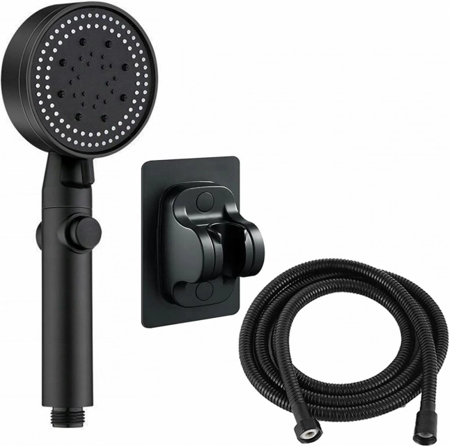 Sprchová hlavica v čiernej farbe. Určená na montáž na štandardnú sprchovú hadicu. Ručná sprcha má funkciu voľby prúdu (5) a funkciu STOP na zastavenie prúdu. Vstavaný ventilátor zvyšuje silu prúdu bez zvýšenia spotreby vody. Dodáva sa s vyhradenou 150 cm dlhou sprchovou hadicou a nástenným držiakom pripevneným lepiacou páskou.