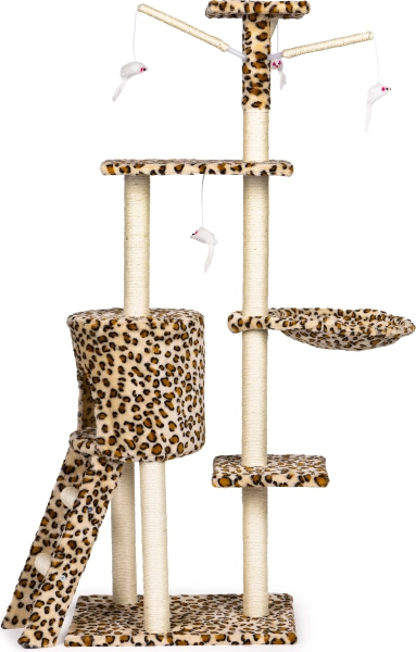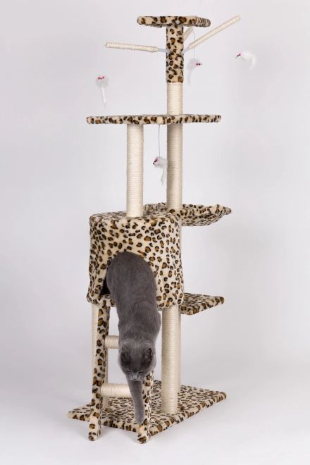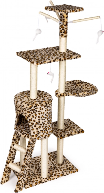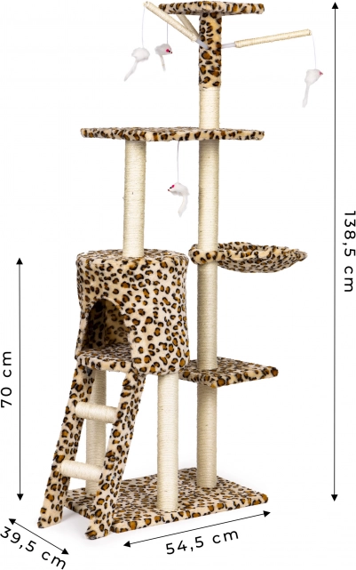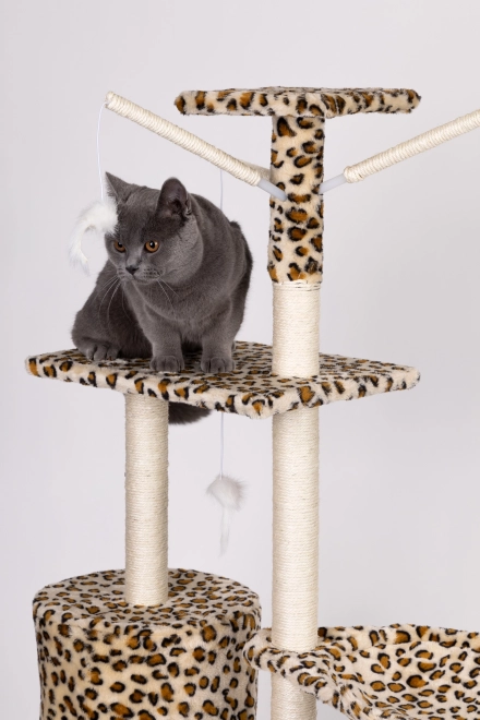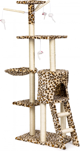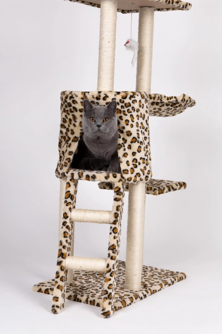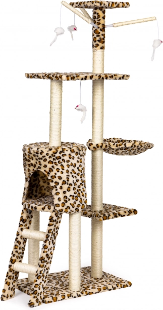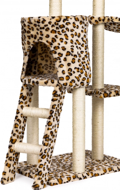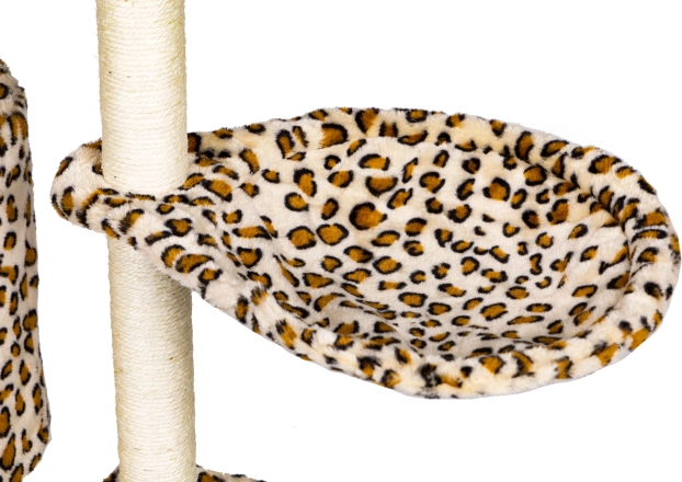 Vytvorte svojej mačke bezpečné útočisko na odpočinok, škrabanie aj hranie. Toto vysoké škrabadlo s leopardím vzorom stojí na pevnej MDF základni a je vybavené sisalom omotanými stĺpikmi, ktoré podporujú prirodzený inštinkt k škrabaniu a zároveň šetria váš nábytok. Nechýba najvyššia vyhliadka, odkiaľ má mačka prehľad o celom priestore.
