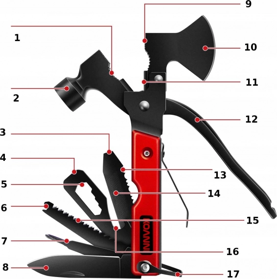 - 17 nástrojov v 1 – sekerka, kladivo, kliešte, nôž, píla a ďalšie