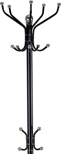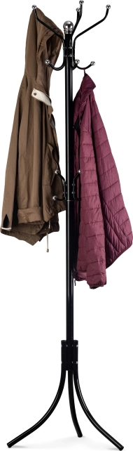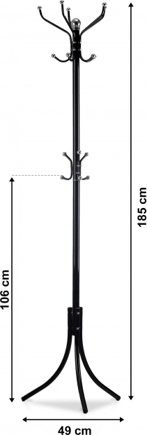 Štýlový vešiak v nadčasovej čiernej farbe je praktickým riešením na udržanie poriadku v predsieni aj kancelárii. Hornú časť tvoria päť ramien, z ktorých každé má dva úchyty na pohodlné zavesenie oblečenia. V strednej časti nájdete tri menšie háčiky na kabelky, šály či dáždniky. Pevná kovová konštrukcia a stabilná trojnohá základňa zaistia istotu pri každodennom používaní.