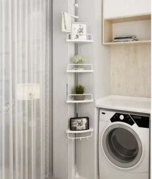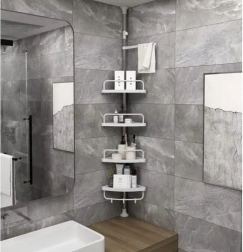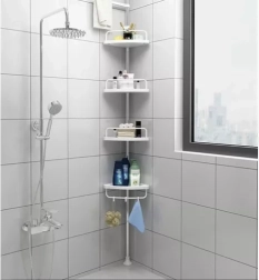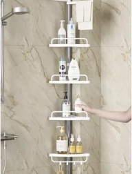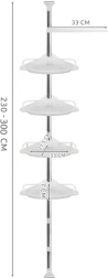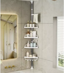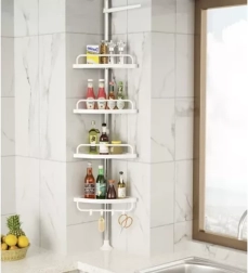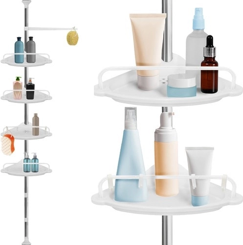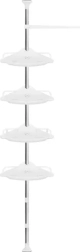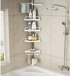 Udržte sprchu dokonale zorganizovanú a všetko potrebné majte vždy po ruke. Táto rohová sprchová polica s rozpernou (teleskopickou) tyčou sa ľahko prispôsobí výške stropu v rozmedzí 230–300 cm a vďaka šikovnému rohovému prevedeniu naplno využije aj malé priestory. Štyri priestranné police dopĺňa praktický vešiak na hubky či kefy – ideálne pre šampóny, kondicionéry, mydlá aj ďalšiu kozmetiku.