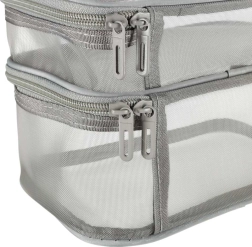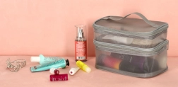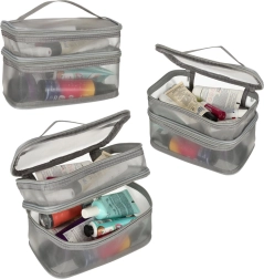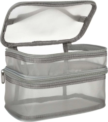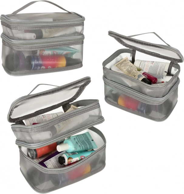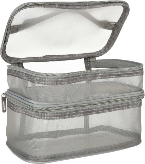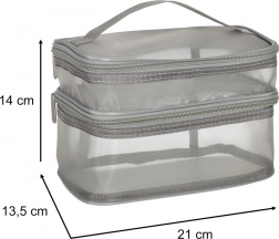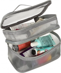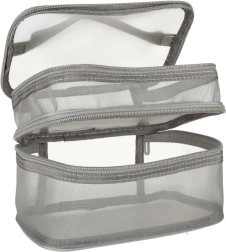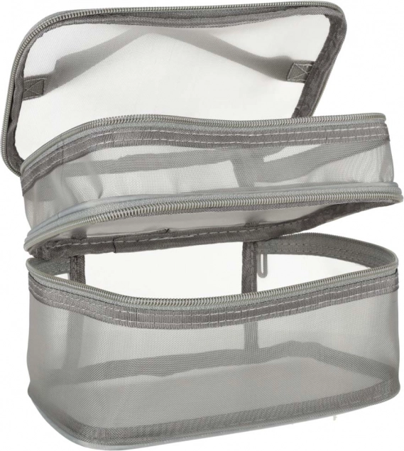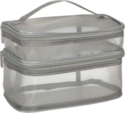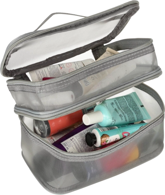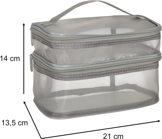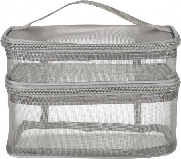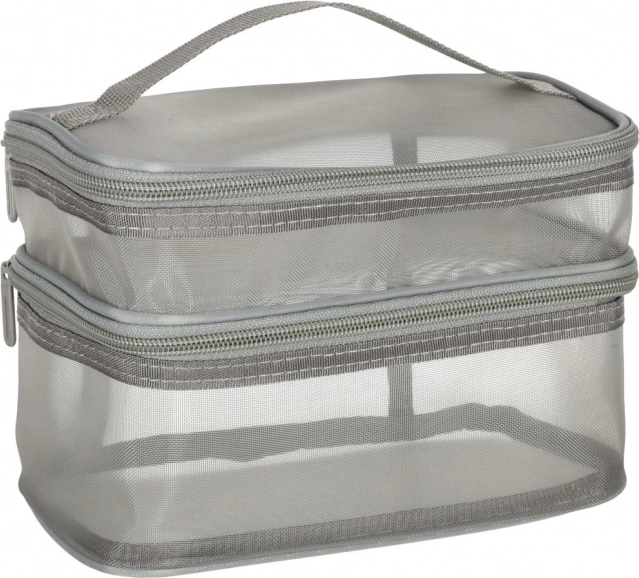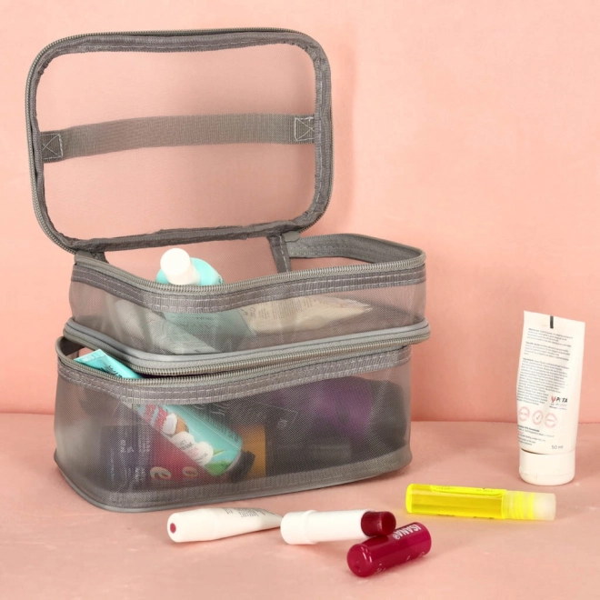 Táto praktická kozmetická taška je nevyhnutným doplnkom na každú cestu. Disponuje dvojkomorovým dizajnom, ktorý umožňuje jednoduchú organizáciu kozmetiky a iných osobných predmetov. Vyrobená zo sieťovaného materiálu, ktorý uľahčuje nájdenie uložených produktov.