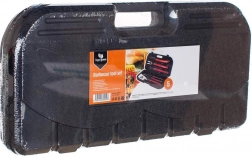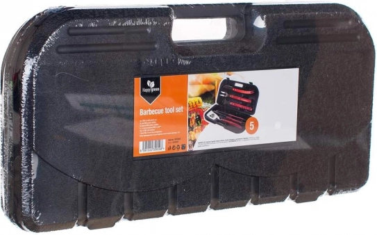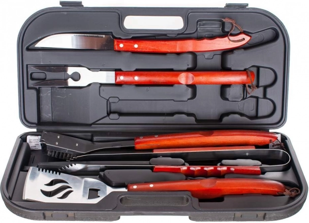Sada sa skladá z 5 kusov: drôtenej čistiacej kefy s dĺžkou 48 cm, grilovacích vrúbkovaných klieští s dĺžkou 45 cm, širokej špachtle s dĺžkou 48 cm, ostrého porcovacieho noža s čepeľou dĺžky 45 cm a vidličky s dvoma hrotmi s dĺžkou 46 cm. Celá sada váži iba 2,08 kg.